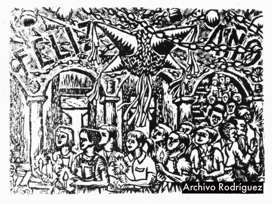 Otras obras alusivas a las fiestas decembrinas son dos grabados de mi padre. De uno de ellos se conserva una foto en el archivo familiar. Se trata de una procesión para cargar los Peregrinos y pedir posada. Sobre la gente se ve una piñata y se lee la inscripción: «Feliz año».