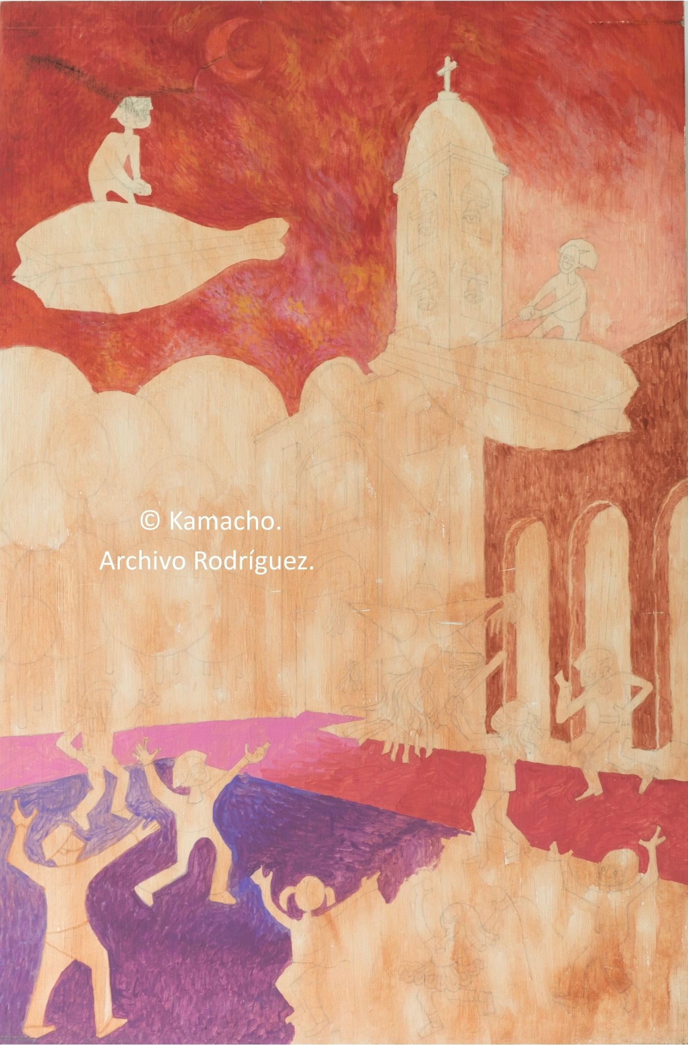 Resulta interesante cómo el artista partió de un grabado de su propia autoría y modificó algunas partes de la composición. El resultado final fue una pintura (acrílico sobre masonite). El grabado se acerca más a su trabajo en el Taller de Gráfica Popular, del cual fue miembro en los 1950s. La pintura, en cambio, muestra su estilo colorido y fantástico de los años 1970s-1980s.